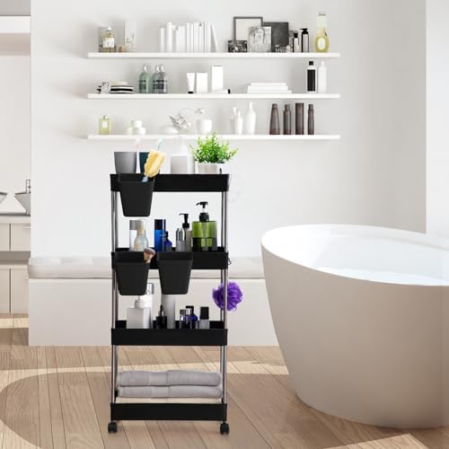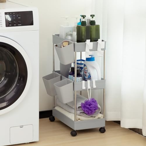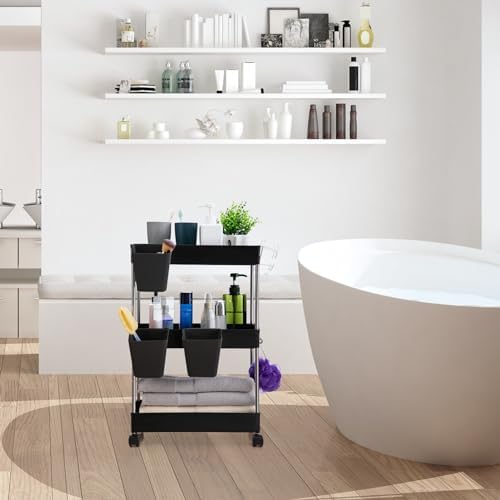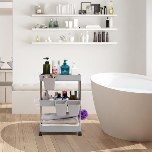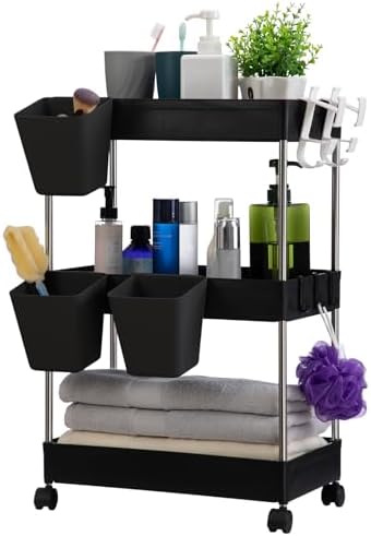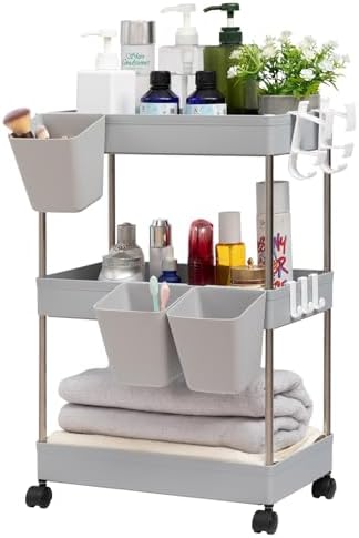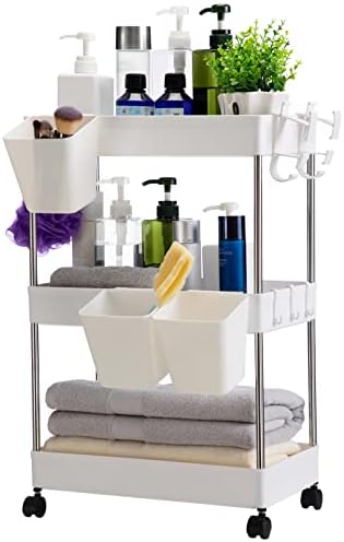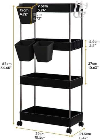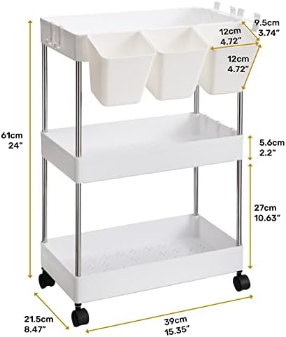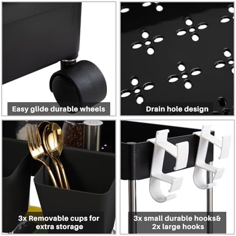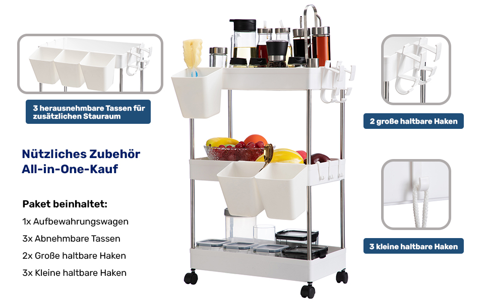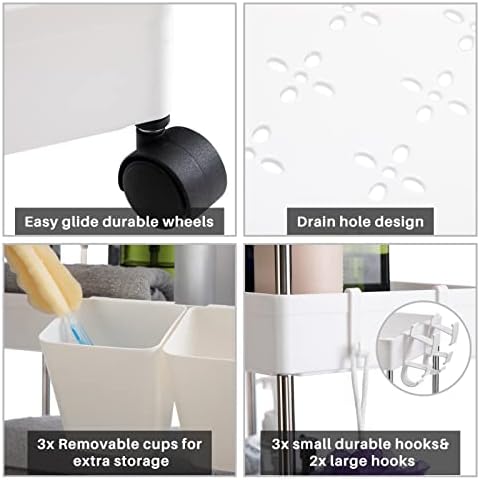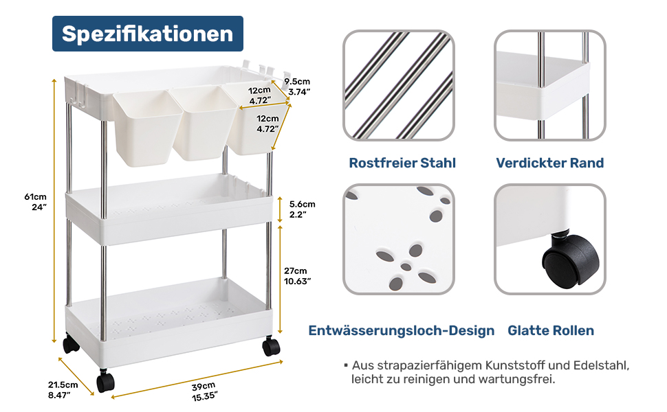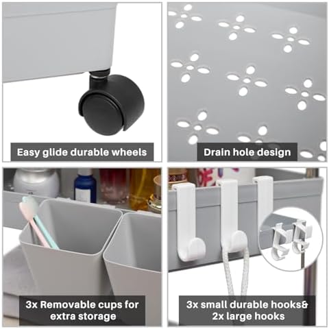 Mit einer Gesamtgröße von 39 cm x 21,5 cm x 61 cm und einer Höhe von 27 cm zwischen den einzelnen Fächern bietet dieser Rollwagen ausreichend Platz für all Ihre täglichen Utensilien. Die drei Körbe und drei Hängebecher sorgen für eine durchdachte Organisation. Dank der erhöhten und verdickten Kanten der Körbe bleiben Ihre Gegenstände auch beim Bewegen des Wagens sicher an ihrem Platz. Maschenlöcher garantieren zudem einen optimalen Luftaustausch, um unangenehme Gerüche zu vermeiden.