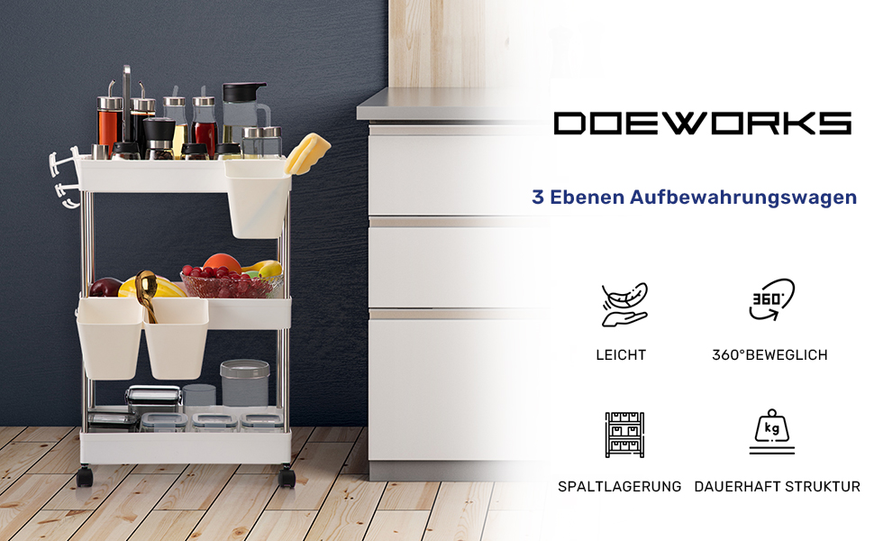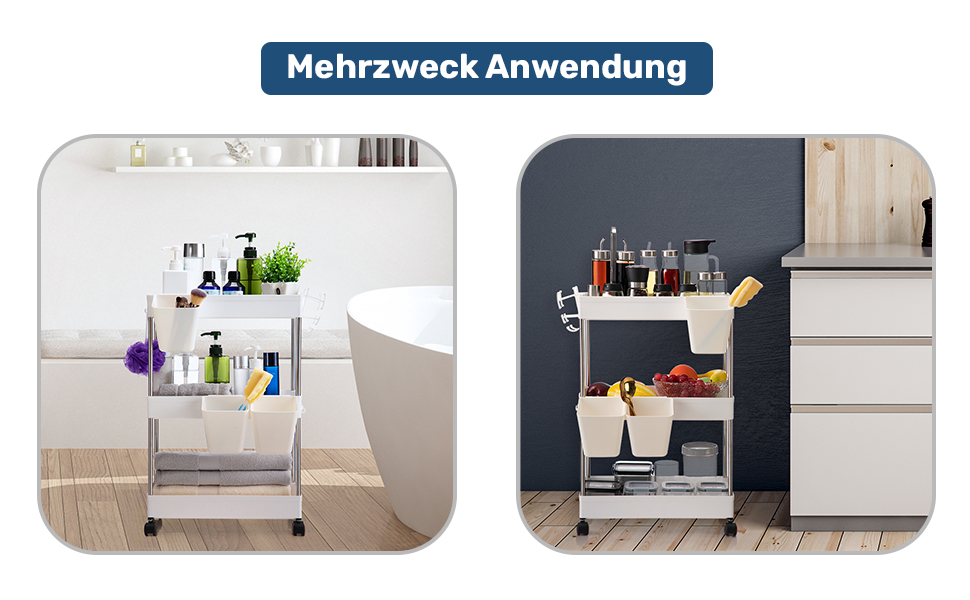 Dieser multifunktionale Aufbewahrungswagen erweist sich als äußerst praktisch für unterschiedlichste Einsatzbereiche. Er fungiert nicht nur als Küchenwagen, sondern eignet sich auch hervorragend als Badezimmerwagen, Barwagen, Bastelwagen oder sogar als Babyzimmerwagen. Durch seine kompakte Bauweise kann er einfach verstaut werden und ist ideal zum Transportieren von Gegenständen, sei es als Organisationsregal, Servierwagen, Lagerregal oder Werkzeugwagen – Ihrer Kreativität sind keine Grenzen gesetzt.