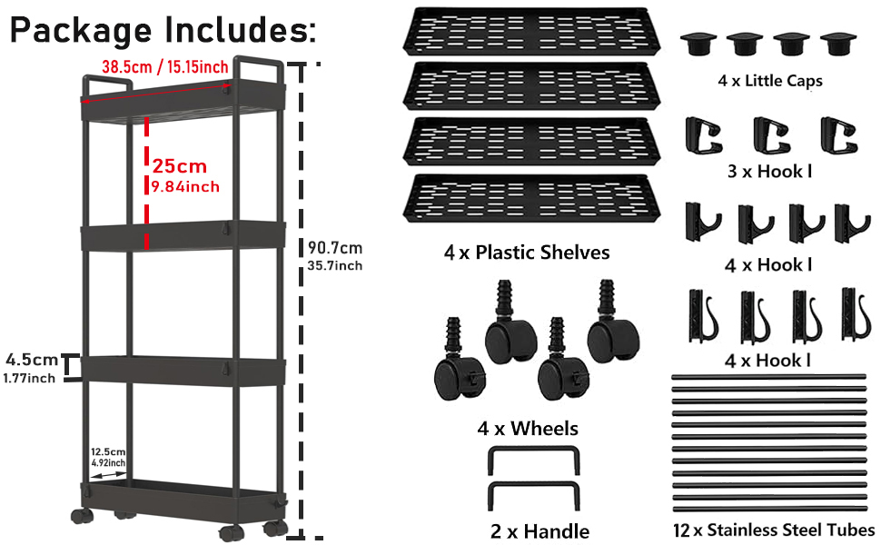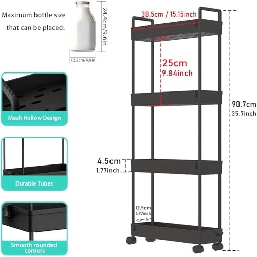 Der vierstöckige Aufbewahrungswagen hat die Maße 38,5 cm x 12,5 cm x 90,7 cm. Mit einer Breite von nur 12,5 cm passt er perfekt in kleine Nischen, sei es in der Küche, im Waschraum oder im Badezimmer. Dieser Wagen maximiert Ihre Aufbewahrungsmöglichkeiten, ohne wertvollen Platz zu opfern.