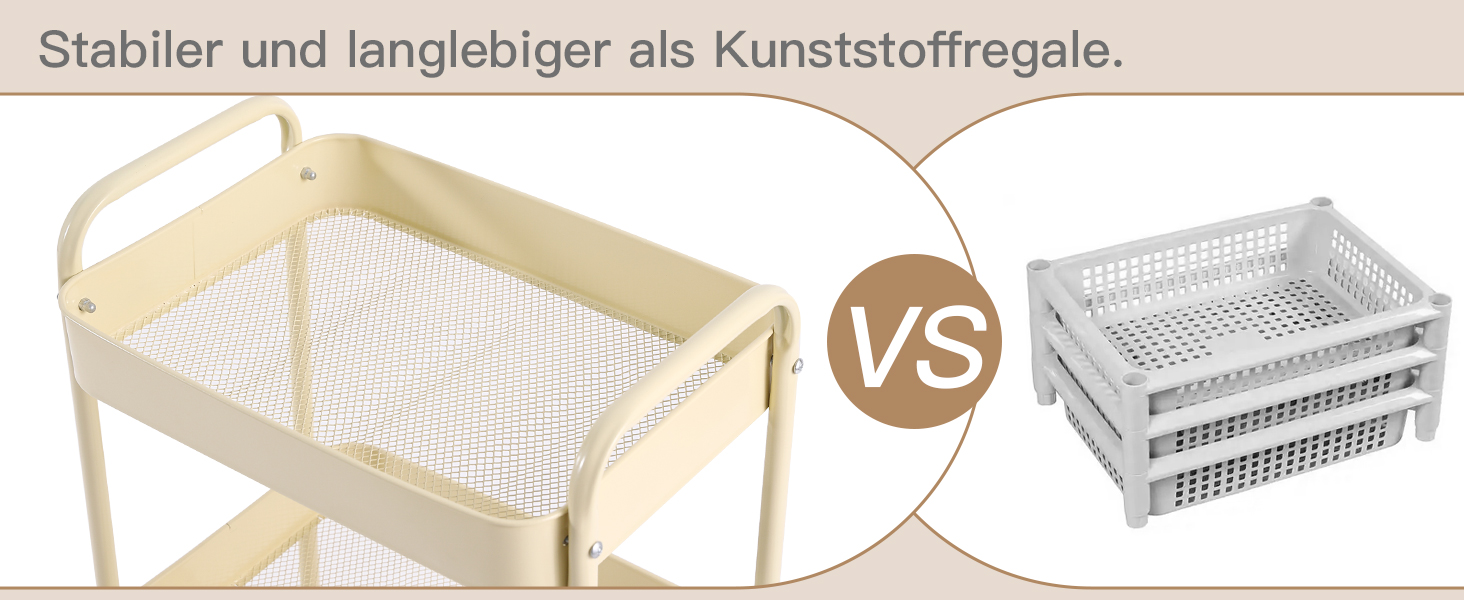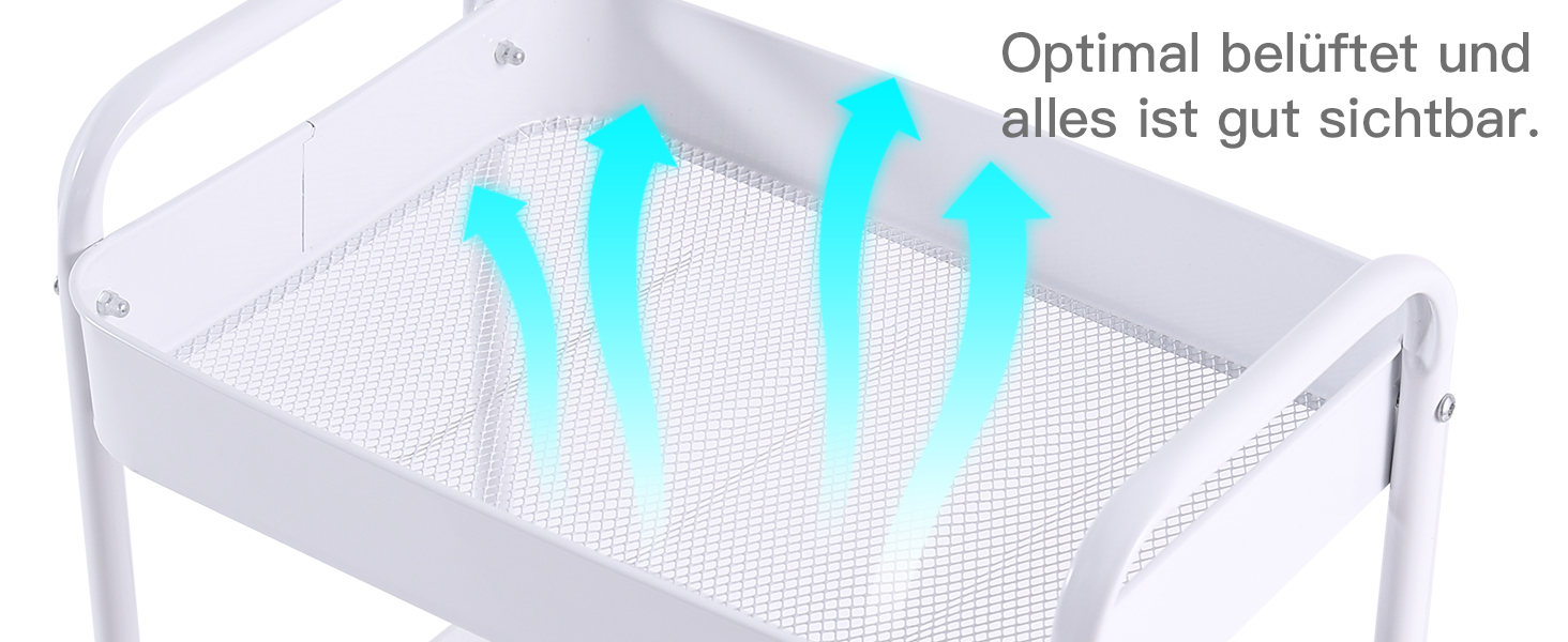 Der Rollwagen besteht aus einem strapazierfähigen Metallrahmen und ist somit auf Langlebigkeit ausgelegt. Die offenen Drahtkörbe fördern die Luftzirkulation und machen ihn ideal für die Lagerung von frischem Obst in der Küche oder feuchten Gegenständen im Badezimmer. So wird einer Feuchtigkeitsansammlung vorgebeugt.
