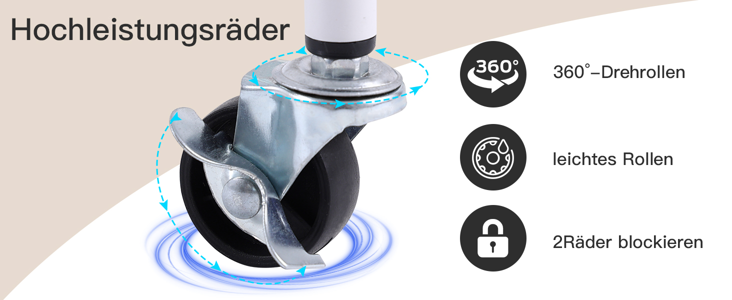 Ausgestattet mit 4 reibungslos drehbaren 360°-Rädern lässt sich dieser Wagen mühelos über verschiedene Bodenbeläge bewegen. Zwei der Räder verfügen über integrierte Bremsen, mit denen die gesamte Einheit sicher fixiert werden kann. Dies gewährleistet Stabilität während der Nutzung und verhindert unerwünschtes Bewegen oder Rollen des Wagens.