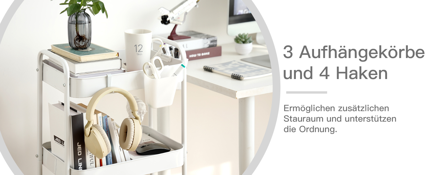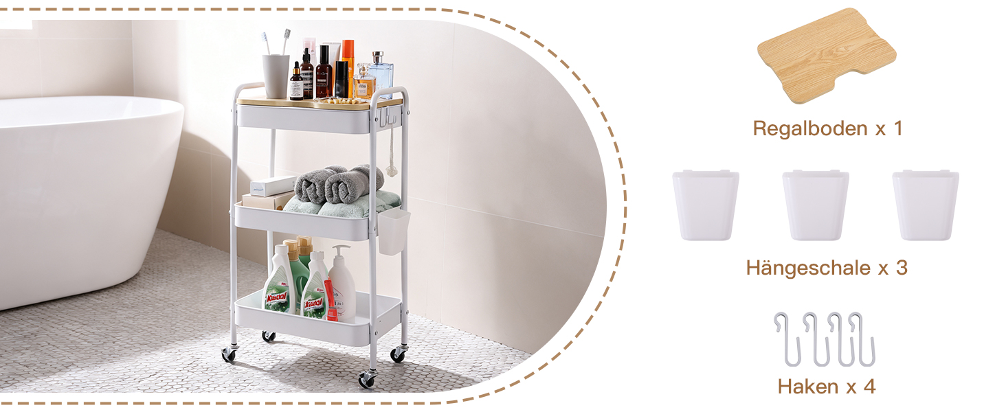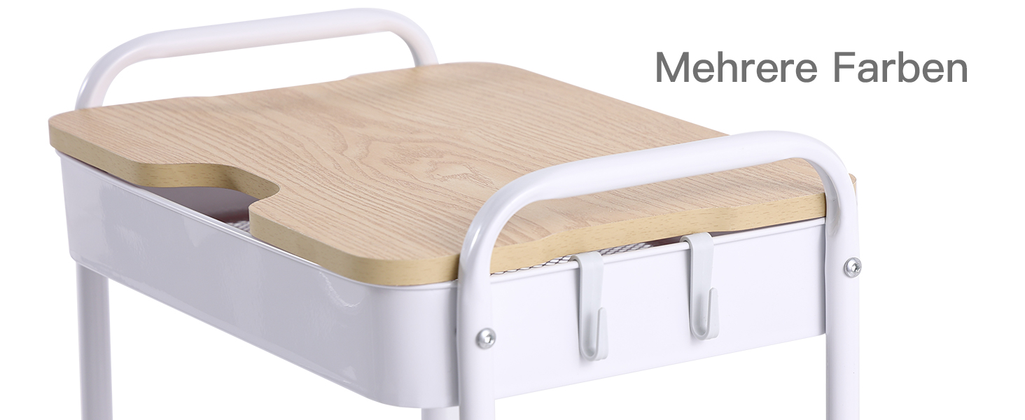Dieser 3-stufige Rollwagen bietet mit seinen 3 Drahtkörben, 4 Haken und einer zusätzlichen Holzplatte reichlich Platz, um Küchenvorräte, Badezimmerutensilien, Büromaterialien oder Bastelmaterialien ordentlich zu organisieren. Die stabile Holzoberfläche eignet sich hervorragend für Pflanzen, Kochbücher oder die Präsentation von Dekor.
